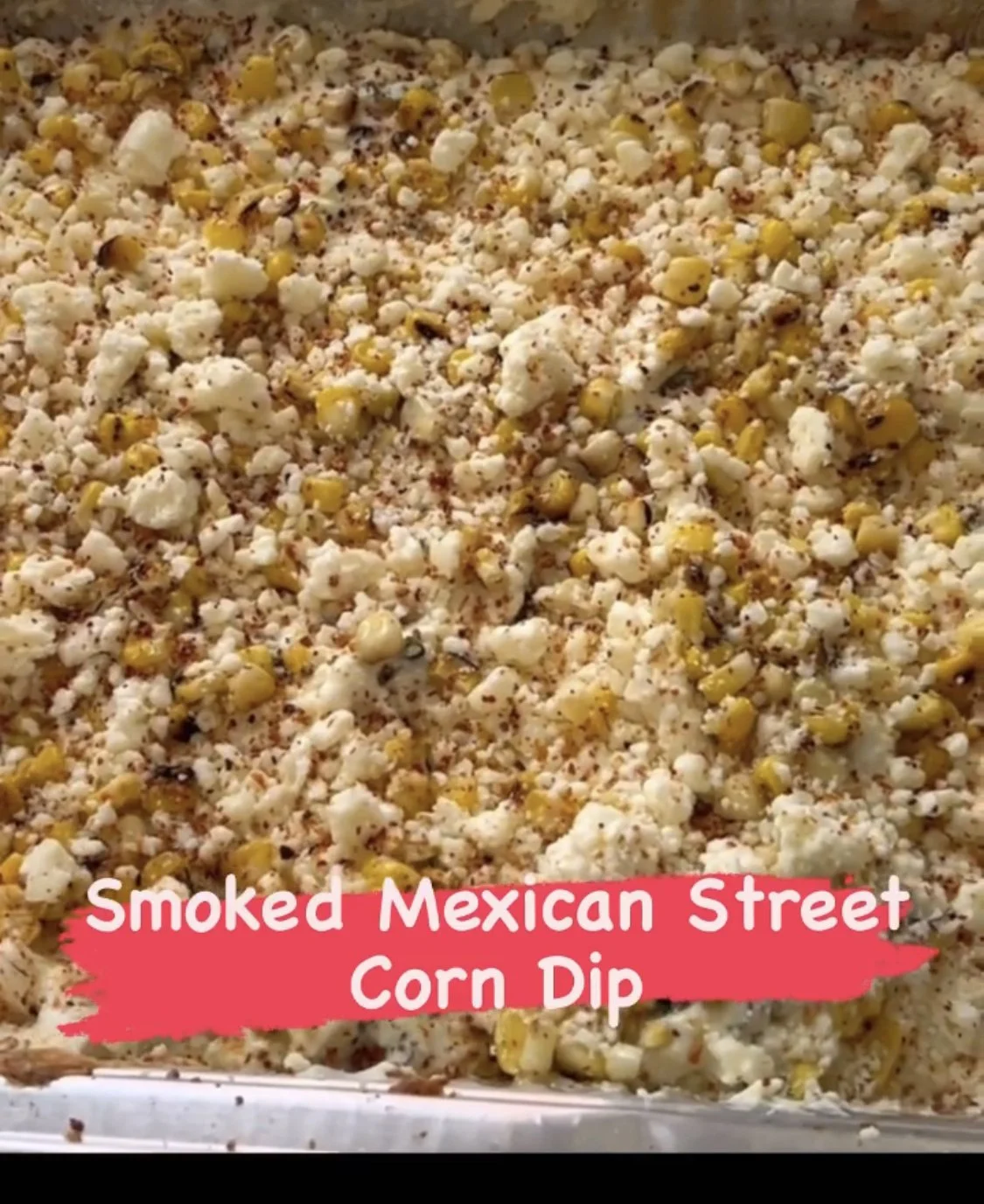Close-up of smoked Mexican street corn dip with yellow corn kernels, a blend of Mexican cheeses, and spices.