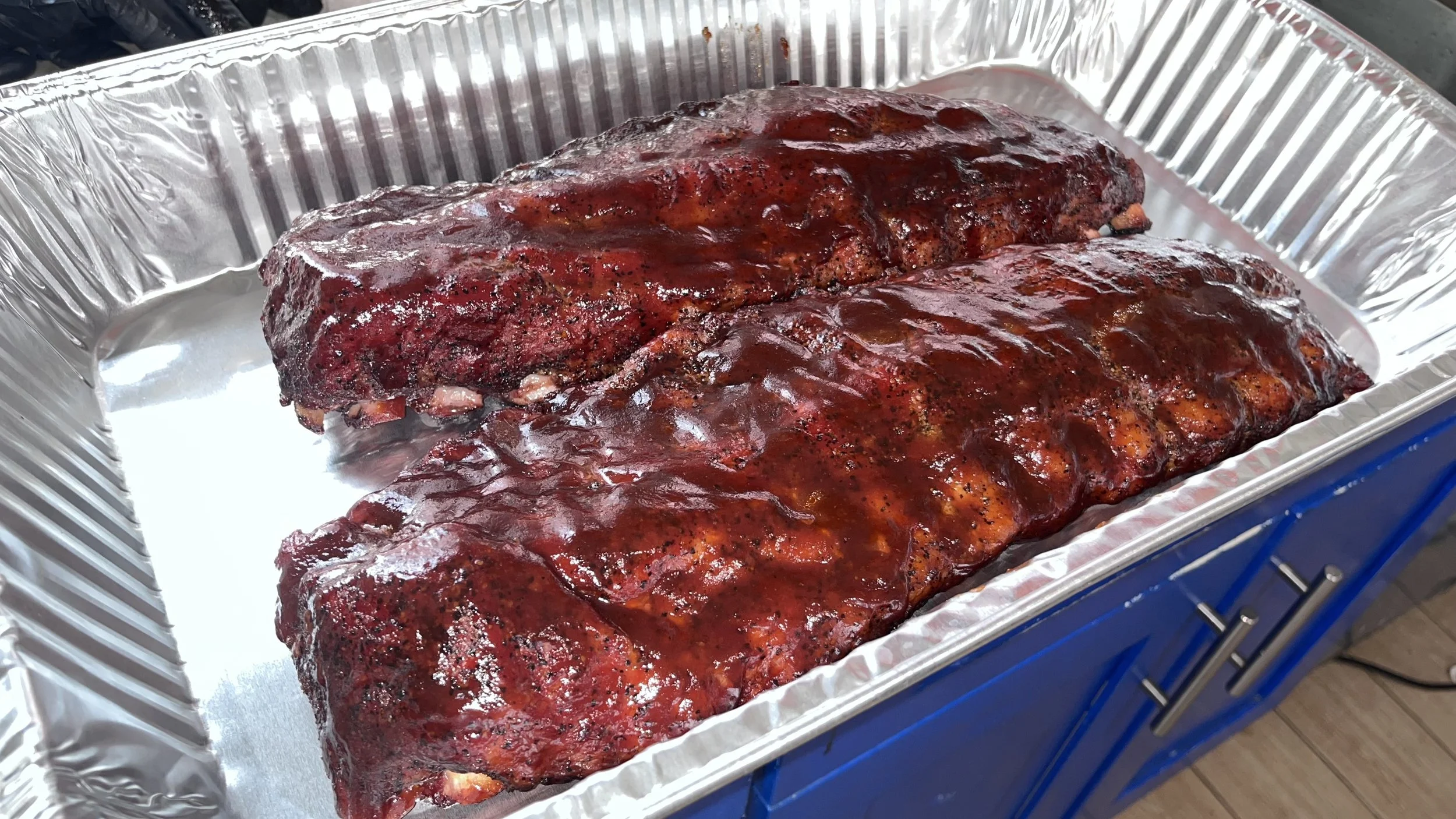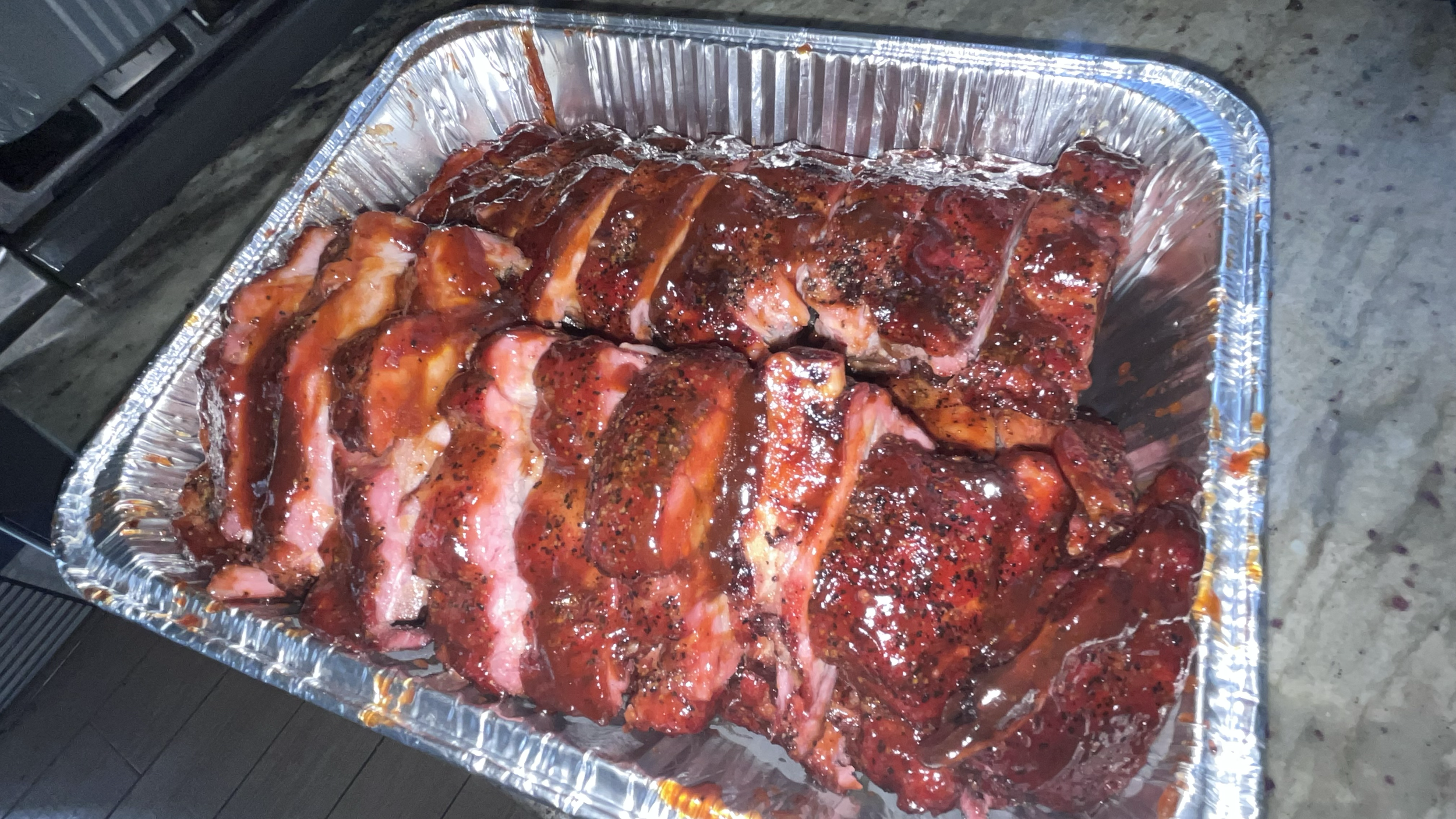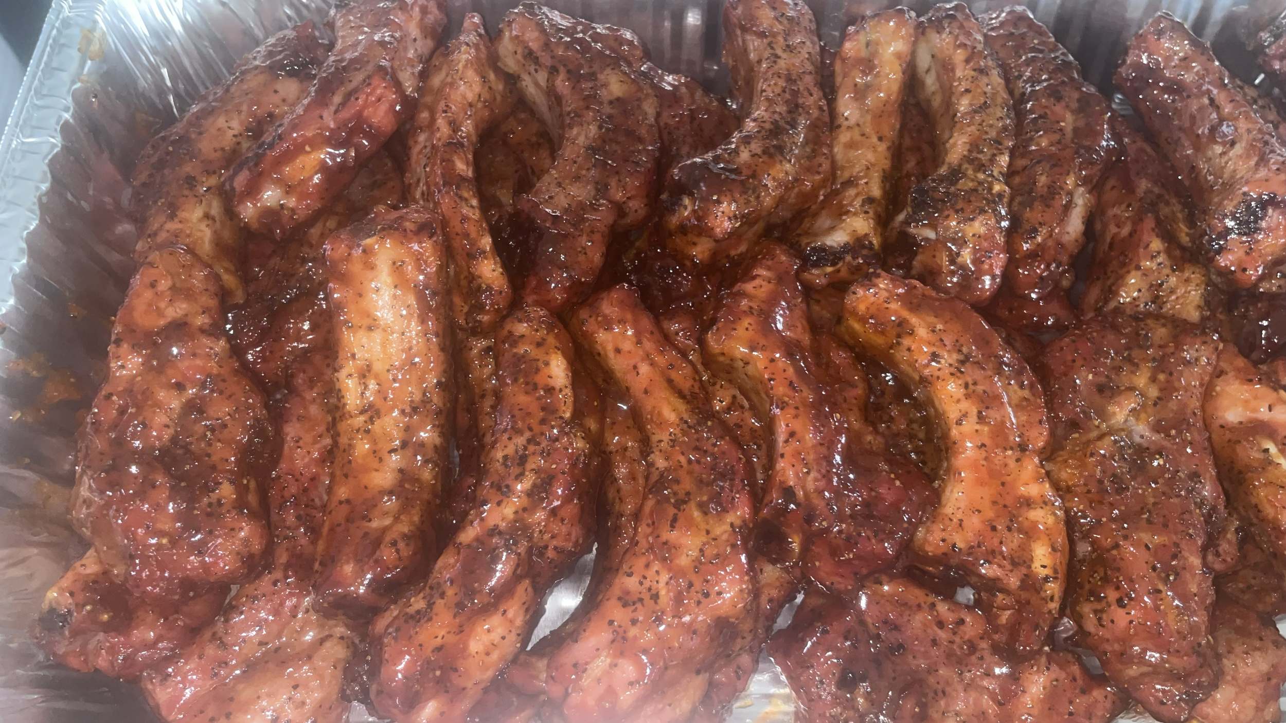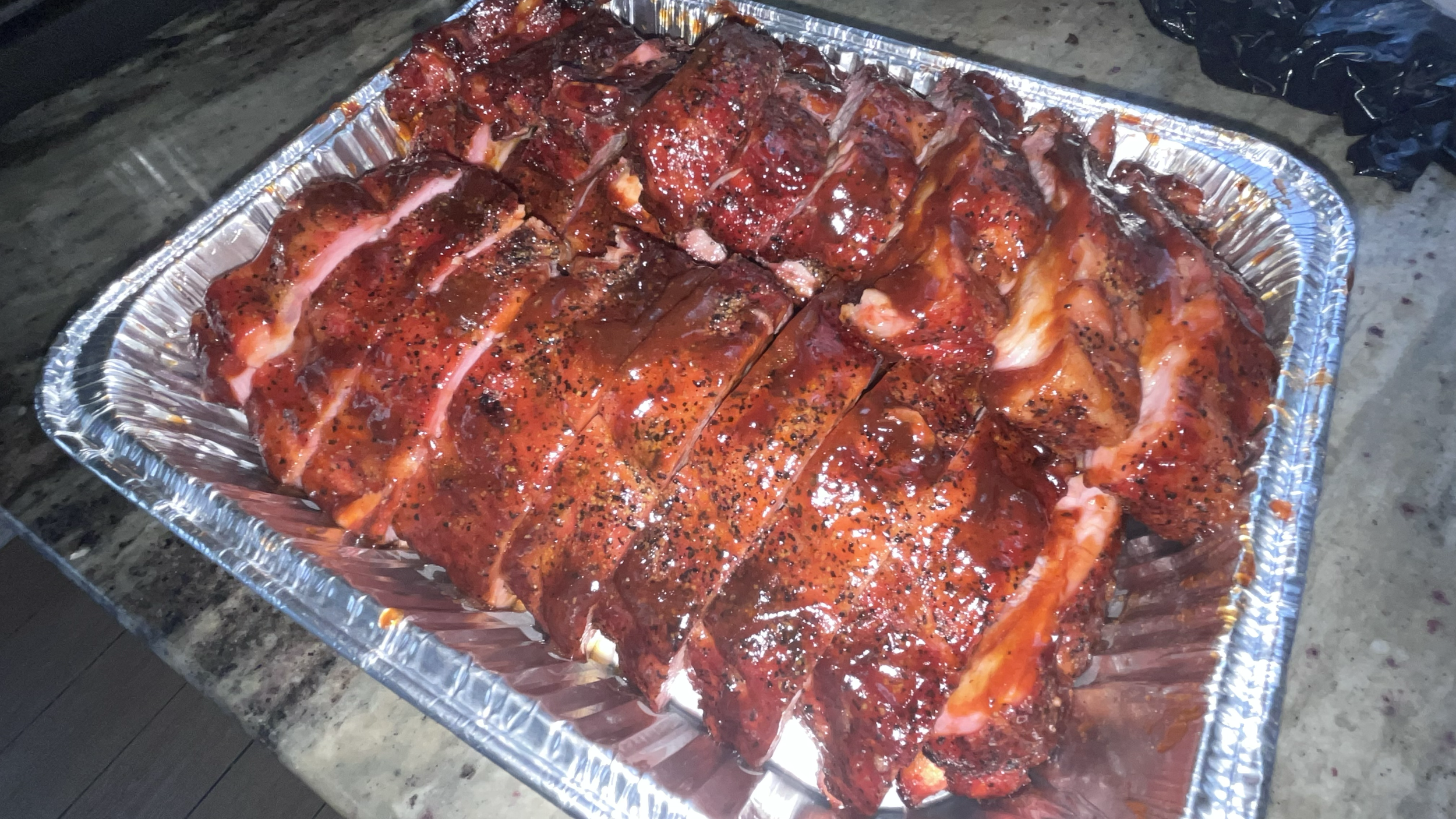 Barbecued racks of ribs coated in sauce, seasoned with black pepper, placed in a silver aluminum tray.