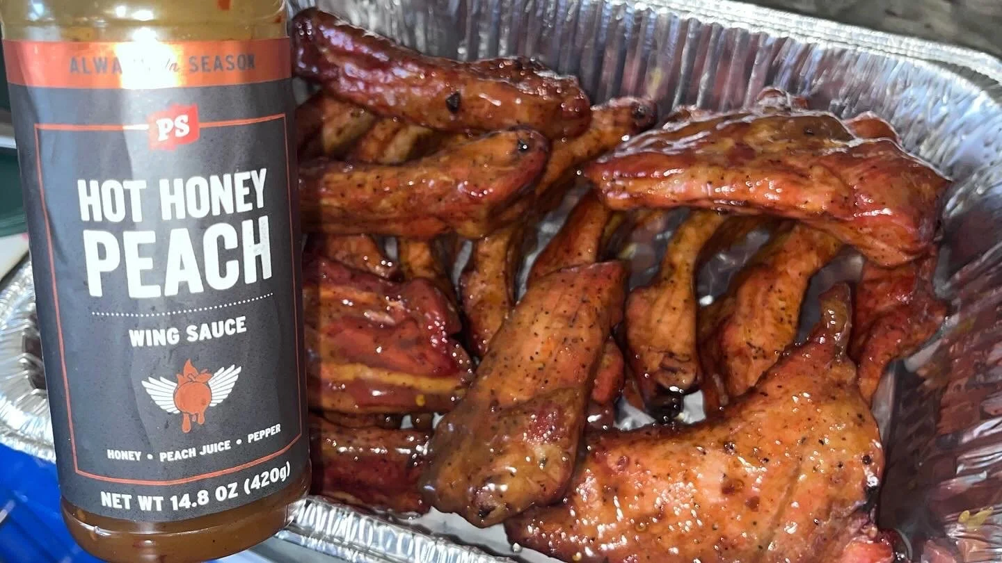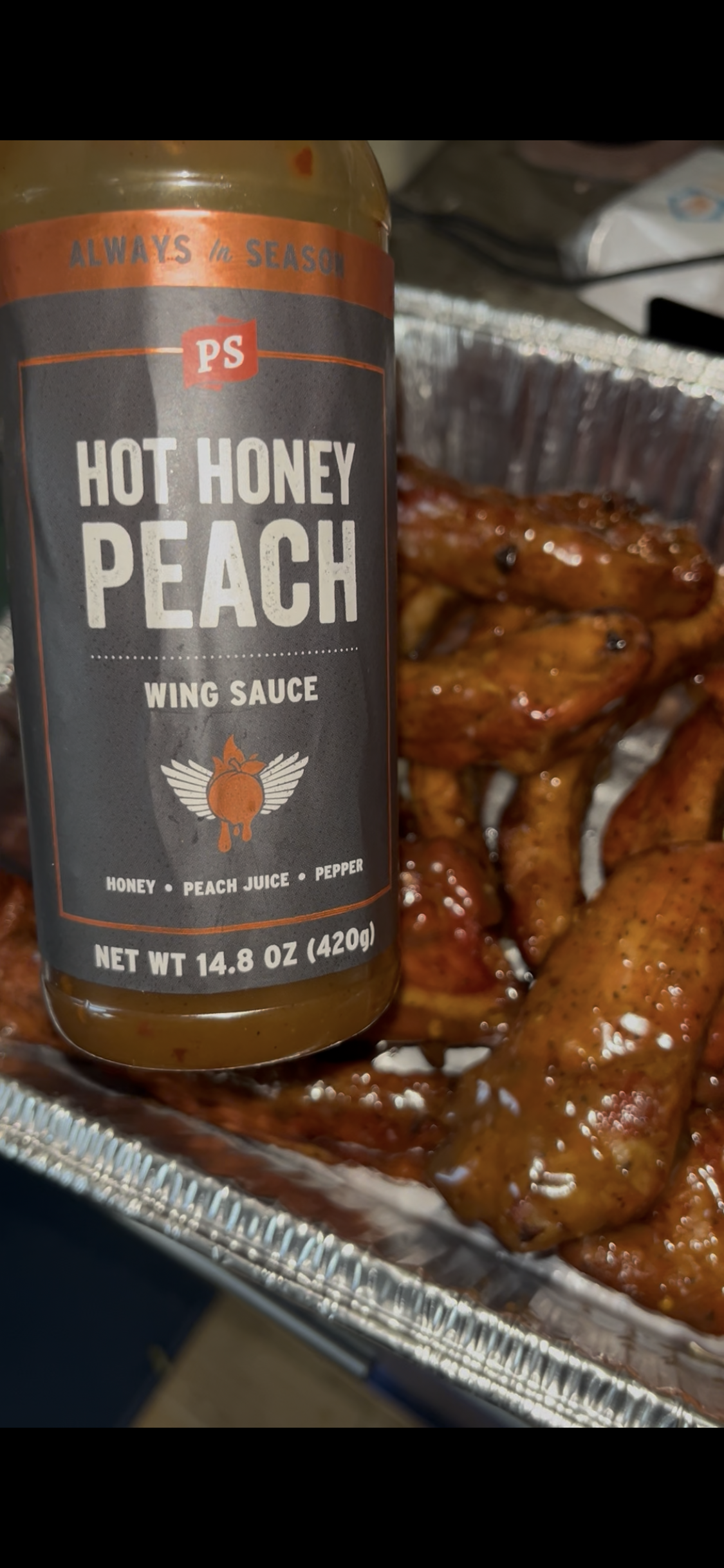 Barbecue chicken wings glazed in hot honey peach wing sauce, in a foil tray.