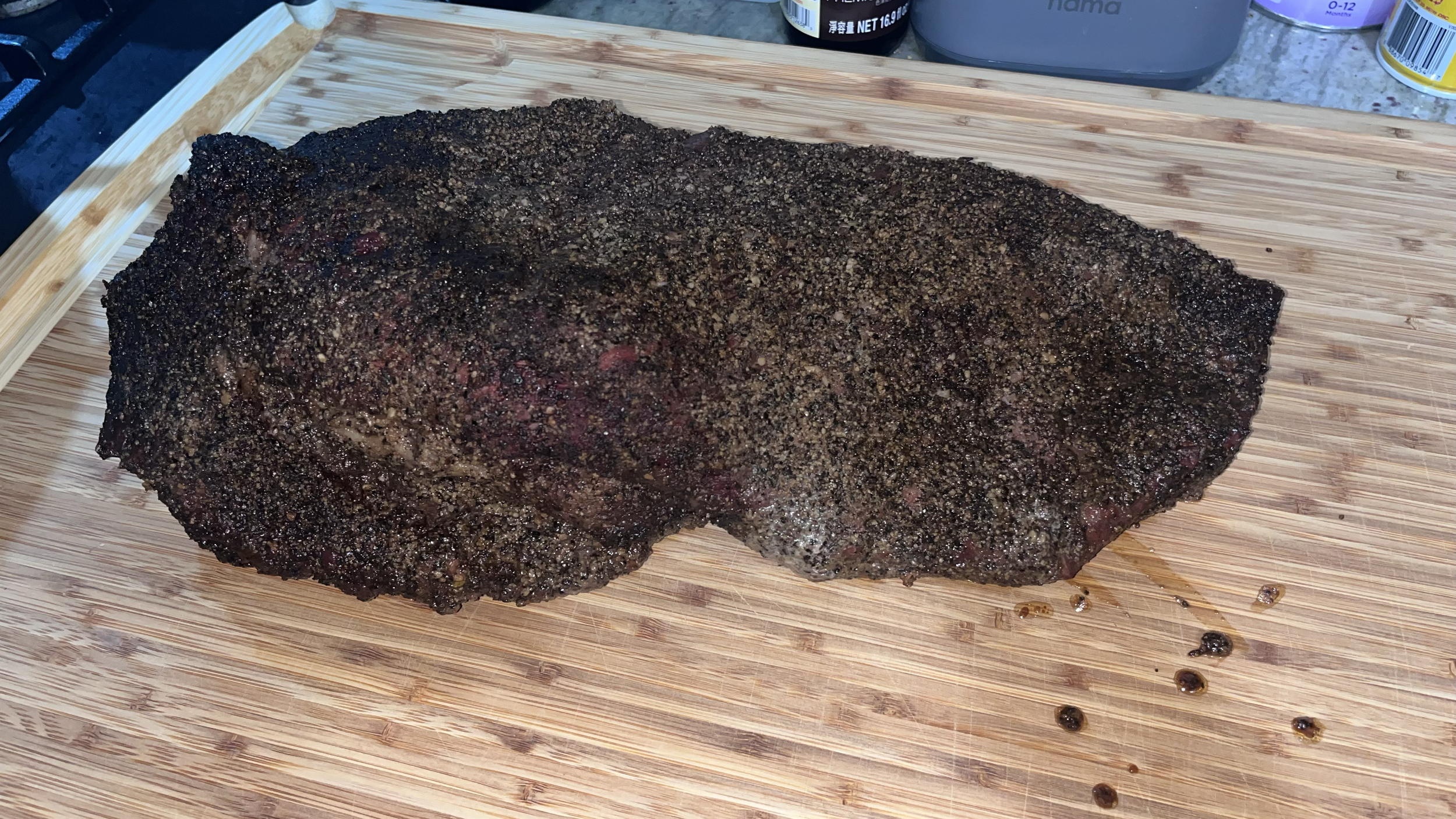 A large, smoked, seasoned piece of meat with a dark, peppery crust resting on a wooden cutting board.