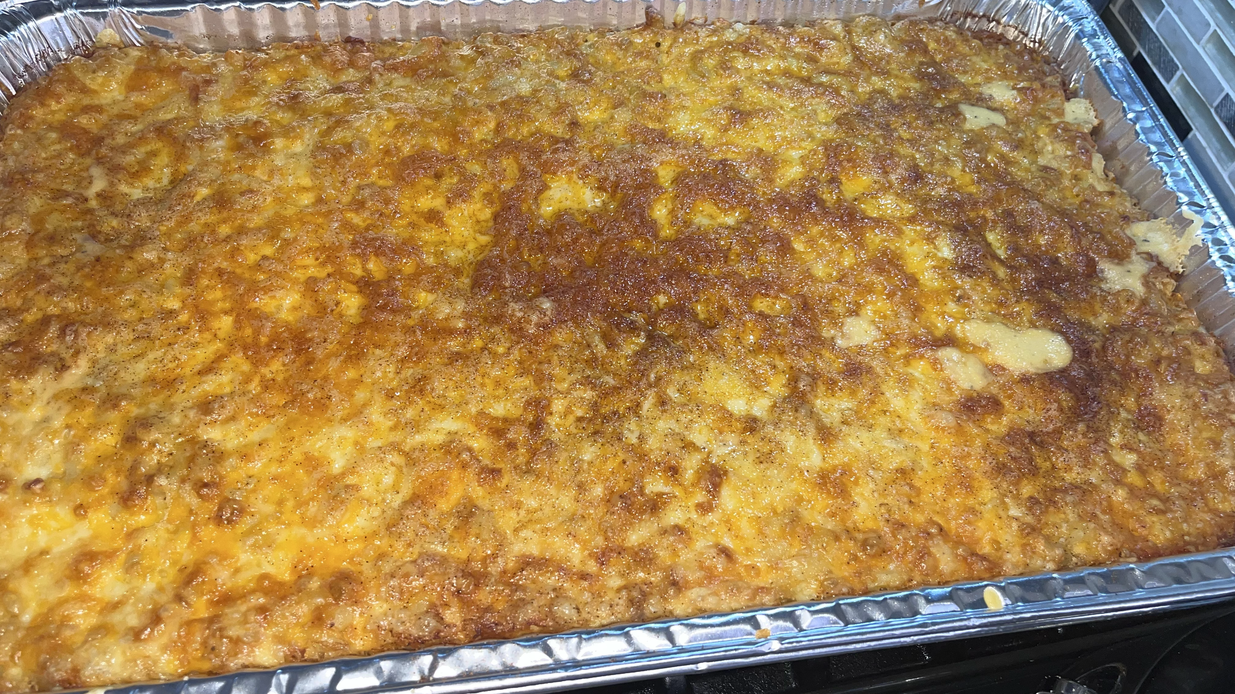 Baked Mac-N-Cheese in an aluminum tray with a golden-brown cheese crust.