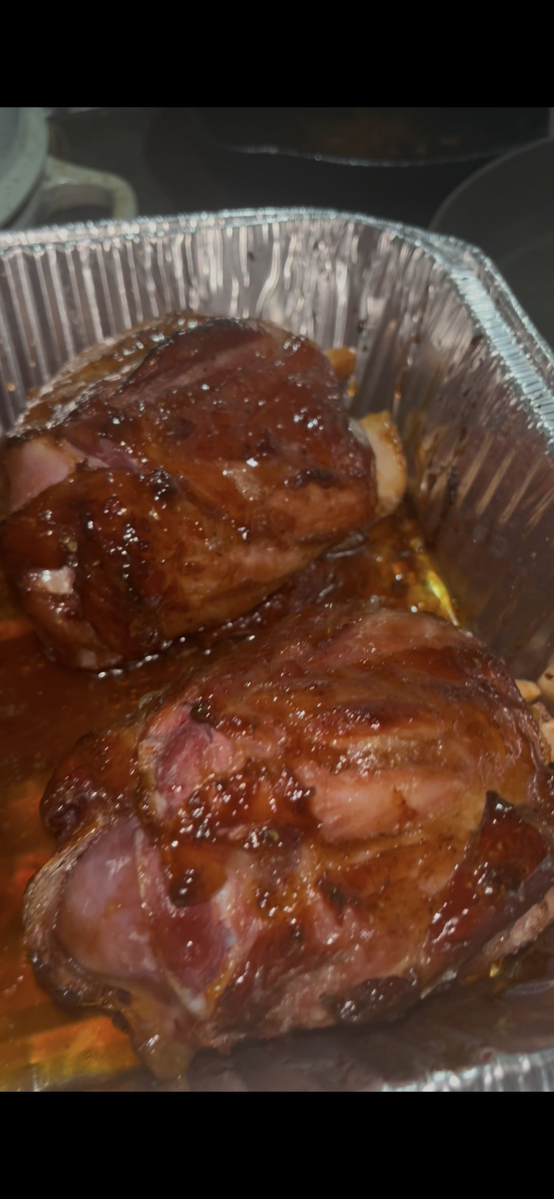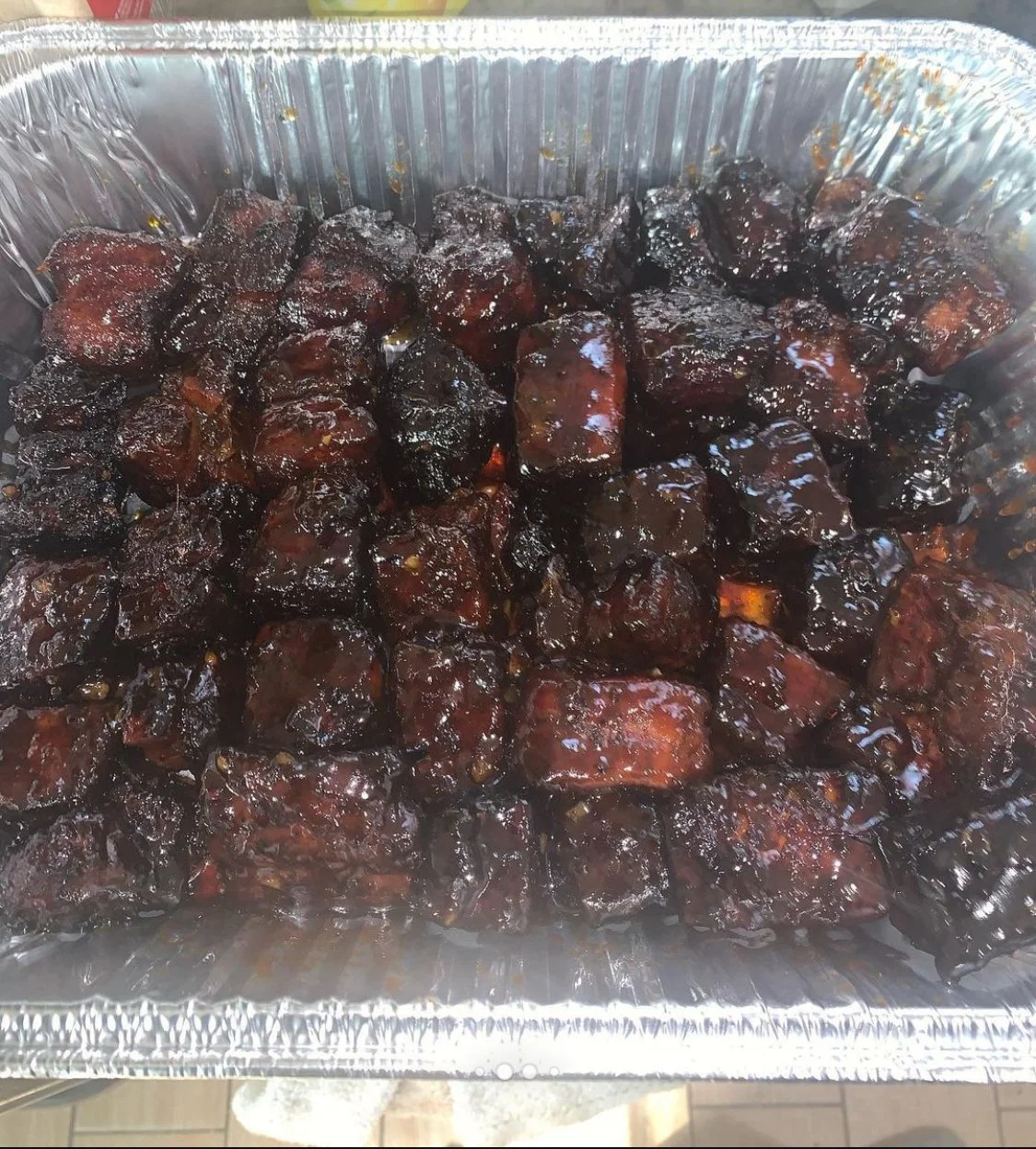 Barbecue ribs coated with sauce in a disposable aluminum tray on a kitchen counter.